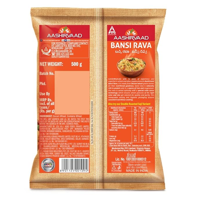 ఉత్కృష్టమైన రవ్వ: ఆశీర్వాద్ ఇప్పుడు తన అనుభవంతో తయారు చేసిన బంసీ రవ్వను అందిస్తోంది, ఇది పోషక విలువలతో ప్రసిద్ధి పొందిన డురమ్ గోధుమలతో తయారవుతుంది.