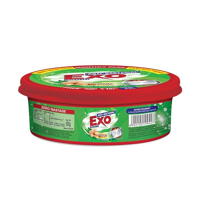 ఎక్సో రౌండ్ డిష్ వాష్ బార్ 500 గ్రాములు | అల్లం యొక్క యాంటీ బాక్టీరియల్ సామర్థ్యం మరియు మంచితనంతో పూర్తి డిష్ వాషింగ్ సొల్యూషన్ కఠినమైన మురికి మరకలను సులభంగా తొలగించండి | పరిశుభ్రత మరియు ఉన్నతమైన శుభ్రపరచడం అనుభవించండి