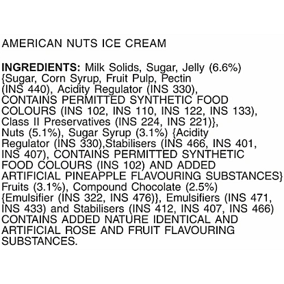 కాంపోనెంట్ అంచనా విలువ (ప్రతి 100ml) గమనికలు శక్తి (కేలరీలు) 130−155 కిలో కేలరీలు పంచదార పాకం నుండి అధిక చక్కెర మరియు గింజలు/క్రీమ్ నుండి కొవ్వు కారణంగా అధిక ముగింపు. మొత్తం కొవ్వు 7−11 గ్రా అధిక కొవ్వు కంటెంట్ దాని క్రీము, రిచ్ ఆకృతికి దోహదం చేస్తుంది. కార్బోహైడ్రేట్ 15−20 g ప్రధాన మూలం చక్కెర మరియు పాకం సిరప్ జోడించబడింది. పాల ఘనపదార్థాలు మరియు మిశ్రమ గింజల నుండి ప్రోటీన్ 2.5−4 గ్రా.
