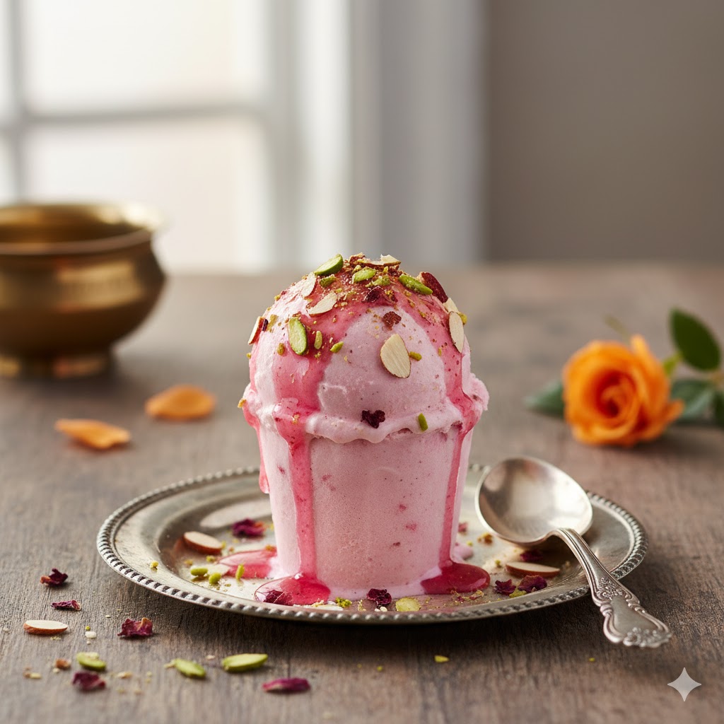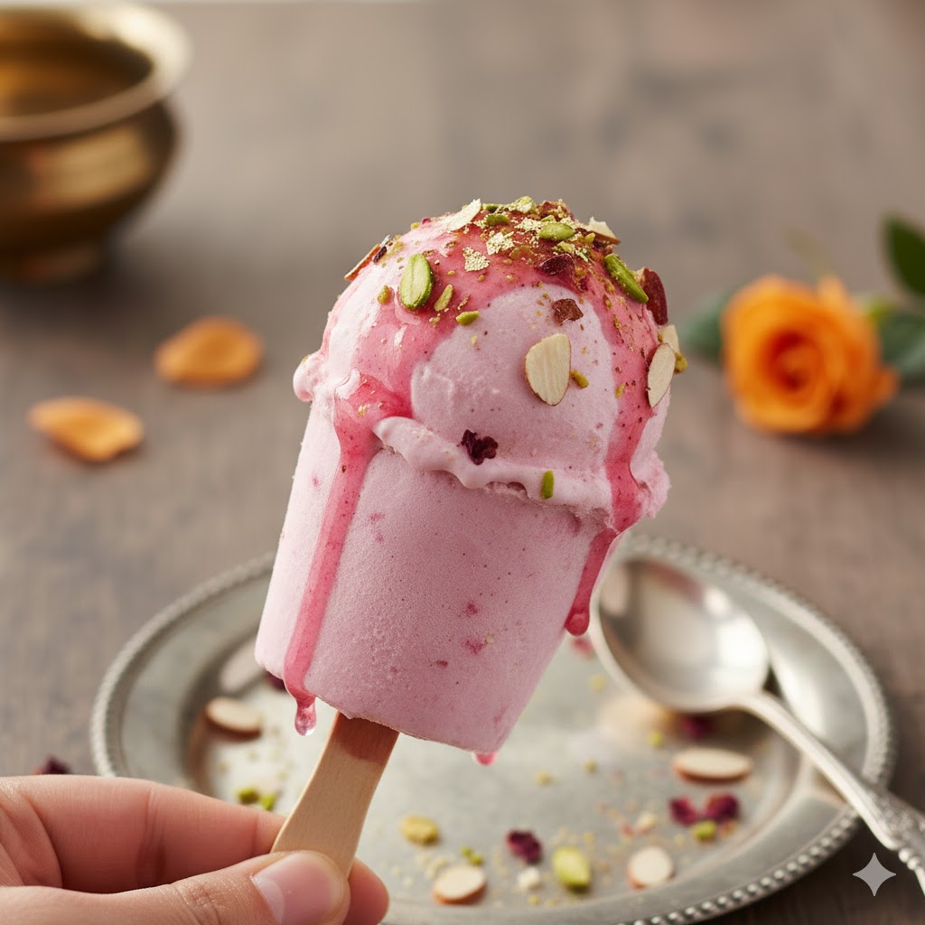 పూర్తి వివరణ రోజ్ కుల్ఫీ అనేది సాంప్రదాయ భారతీయ ఘనీభవించిన పాల డెజర్ట్ అయిన కుల్ఫీ యొక్క ప్రసిద్ధ మరియు సొగసైన రుచి. ఇది రిఫ్రెష్, దట్టమైన ఘనీభవించిన బార్లో వికసించే గులాబీ తోట యొక్క సారాన్ని సంగ్రహిస్తుంది. తయారీ మరియు ఆకృతి అన్ని సాంప్రదాయ కుల్ఫీల మాదిరిగానే, బేస్ ఒక శ్రమతో కూడిన ప్రక్రియ ద్వారా సృష్టించబడుతుంది, ఇక్కడ పూర్తి కొవ్వు పాలను చాలా కాలం పాటు నెమ్మదిగా ఉడకబెట్టడం జరుగుతుంది, దాని పరిమాణాన్ని గణనీయంగా తగ్గిస్తుంది (తరచుగా మూడవ వంతు లేదా సగం వరకు). ఇది పాల ఘనపదార్థాలను మరియు సహజ చక్కెరలను కేంద్రీకరిస్తుంది, కుల్ఫీకి సహజంగా తీపి, కొద్దిగా పంచదార పాకం మరియు గొప్ప రుచిని ఇస్తుంది. ఆకృతి: మిశ్రమాన్ని సాధారణ ఐస్ క్రీం లాగా మలిచన చేయనందున, తుది ఉత్పత్తి చాలా దట్టంగా, మందంగా మరియు మసకగా ఉంటుంది. ఇది నెమ్మదిగా కరిగే లక్షణం ద్వారా వర్గీకరించబడుతుంది, ఇది వేసవి వేడికి అనువైనదిగా చేస్తుంది.