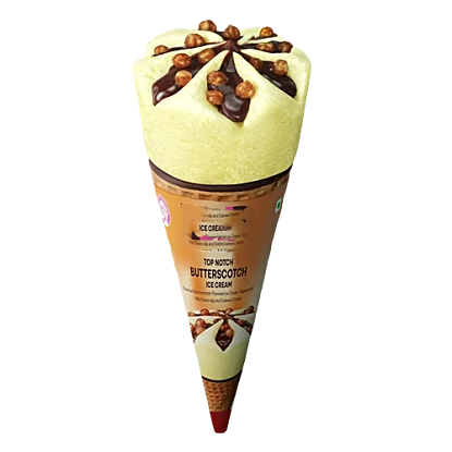 బటర్స్కాచ్ ఐస్ క్రీం: స్టెబిలైజర్లు మరియు ఎమల్సిఫైయర్లతో పాటు నీరు, పాల ఘనపదార్థాలు, చక్కెర మరియు బటర్స్కోచ్ సువాసనతో తయారు చేయబడింది. కోన్ (వేఫర్ బిస్కెట్): శుద్ధి చేసిన గోధుమ పిండి (మైదా), చక్కెర మరియు తినదగిన నూనెతో తయారు చేస్తారు. టాపింగ్: మిల్క్ చాక్లెట్ లేదా చాక్లెట్-ఫ్లేవర్డ్ కాంపౌండ్ కోటింగ్, తరచుగా జీడిపప్పు క్రంచ్ లేదా ప్రలైన్ ముక్కలతో ఉంటుంది. అలర్జీ సమాచారం: వీటిని కలిగి ఉంటుంది: పాలు, గోధుమలు (గ్లూటెన్), మరియు ట్రీ నట్స్ (జీడిపప్పు). కలిగి ఉండవచ్చు: సోయా. గమనిక: అత్యంత ఖచ్చితమైన మరియు బ్రాండ్-నిర్దిష్ట సమాచారం కోసం, ఉత్పత్తి ప్యాకేజింగ్పై ముద్రించిన పోషక లేబుల్ని ఎల్లప్పుడూ చూడండి, ఎందుకంటే తయారీదారుల మధ్య ఖచ్చితమైన విలువలు మారవచ్చు.