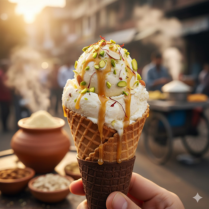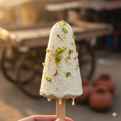డెజర్ట్: మలై కుల్ఫీ అనేది సాంప్రదాయ భారతీయ ఘనీభవించిన డెజర్ట్, దీనిని తరచుగా "సాంప్రదాయ భారతీయ ఐస్ క్రీం" అని పిలుస్తారు. ఇది చాలా దట్టంగా, క్రీమీగా ఉంటుంది మరియు ప్రామాణిక ఐస్ క్రీం కంటే నెమ్మదిగా కరుగుతుంది ఎందుకంటే ఇది నెమ్మదిగా ఉడికించిన, తగ్గించిన పాలతో తయారు చేయబడుతుంది మరియు మధనపడదు (అంటే దీనికి తక్కువ గాలి ఉంటుంది). రుచి ("మలై"): "మలై" అనే పదానికి క్రీమ్ అని అర్థం, ఈ డెజర్ట్ యొక్క ఆధారం అయిన గొప్ప, సాంద్రీకృత, వండిన పాల రుచిని సూచిస్తుంది. ఇది సాధారణంగా ఏలకులు (ఎలైచి) వంటి సుగంధ ద్రవ్యాలతో మరియు కొన్నిసార్లు కుంకుమపువ్వు (కేసర్) యొక్క సూచనతో రుచిగా ఉంటుంది, తరచుగా పిస్తాపప్పులు మరియు బాదం వంటి తరిగిన గింజలను కలిపి లేదా పైన చల్లుతారు. ఆకారం ("కోన్"): కుల్ఫీ సాంప్రదాయకంగా అచ్చులలో ఘనీభవించబడుతుంది. కోన్ ఆకారం అత్యంత క్లాసిక్ మరియు గుర్తించదగిన రూపాలలో ఒకటి, అందుకే "కుల్ఫీ కోన్" అనే పదం వచ్చింది. చారిత్రాత్మకంగా, విక్రేతలు కుల్ఫీ మిశ్రమాన్ని చిన్న మెటల్ లేదా ప్లాస్టిక్ కోన్-ఆకారపు అచ్చులలో (కొన్నిసార్లు కుల్ఫీ అచ్చులు అని పిలుస్తారు) పోసి మంచు మరియు ఉప్పు మిశ్రమంలో స్తంభింపజేస్తారు. వడ్డించేటప్పుడు, ఘనీభవించిన కుల్ఫీని సాధారణంగా కోన్-ఆకారపు లోహపు అచ్చు నుండి విప్పి, తరచుగా కర్రపై అందజేస్తారు లేదా కొన్నిసార్లు ముక్కలుగా కట్ చేసి ఆకు లేదా ప్లేట్లో వడ్డిస్తారు.