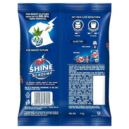 రిన్ డిటర్జెంట్ ఉపయోగాలు: మురికి మరియు మరకలను తొలగిస్తుంది - దుమ్ము, బురద, గ్రీజు మరియు రోజువారీ మరకలను తొలగించడంలో సహాయపడుతుంది. దుస్తులను ప్రకాశవంతం చేస్తుంది - తెల్లని వాటిని ప్రకాశవంతంగా మరియు రంగులను మరింత ప్రకాశవంతంగా చేస్తుంది. బట్టలపై సున్నితంగా ఉంటుంది - బట్టలకు తీవ్ర నష్టం లేకుండా శుభ్రపరుస్తుంది. బహుళ వాష్ రకాలకు అనుకూలం - హ్యాండ్ వాష్, సెమీ ఆటోమేటిక్ మరియు టాప్-లోడ్ యంత్రాలు. తాజా సువాసన - బట్టలు తాజాగా మరియు శుభ్రంగా వాసన చూస్తాయి. కరిగించడం సులభం - వేడి మరియు చల్లటి నీటిలో బాగా పనిచేస్తుంది.