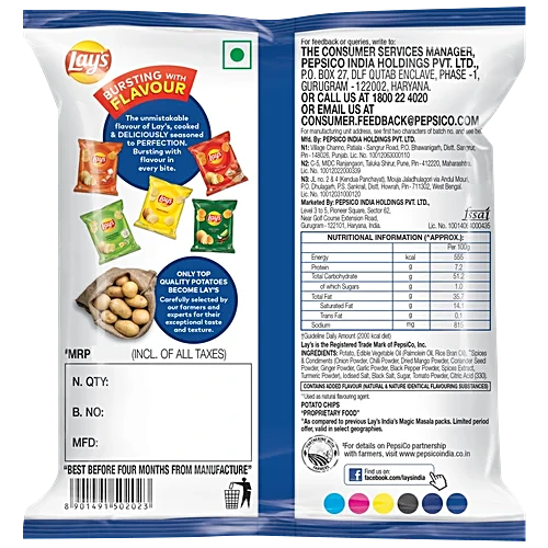తీవ్రమైన రుచి: లేస్ ఇండియాస్ మ్యాజిక్ మసాలా ప్రత్యేకమైన మసాలా మిశ్రమంతో మీ రుచిచాపలను తాకట్టి మత్తెక్కించే అనుభూతిని ఇస్తుంది.