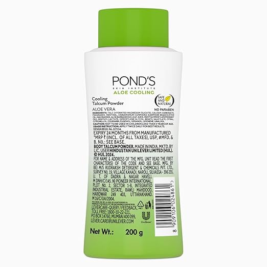 🌸 సుగంధం:పాండ్స్ ఆలొ వ కూలింగ్ పౌడర్ ప్రత్యేకమైన తాజా సువాసనతో రోజంతా మీరు ఉత్సాహంగా, ధైర్యంగా ఉండడానికి సహాయపడుతుంది.