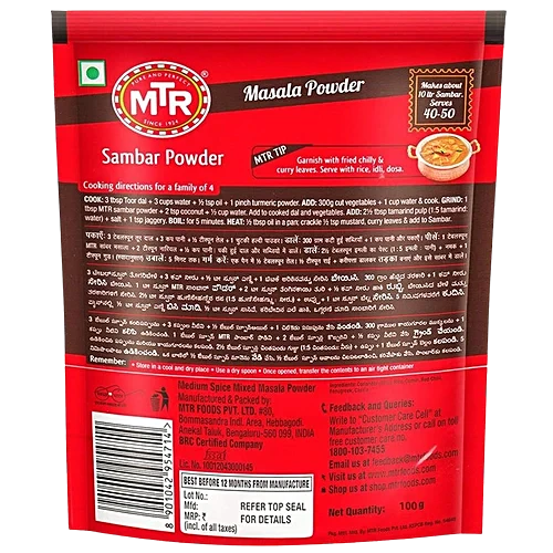 Cook toor dal (pigeon peas) until soft. Add tamarind extract, vegetables (like drumstick, brinjal, carrot, or beans), and boil. Mix MTR Sambar Masala with water and add to the boiling mixture.Simmer until the flavors blend well and finish with a tempering of mustard seeds & curry leaves.